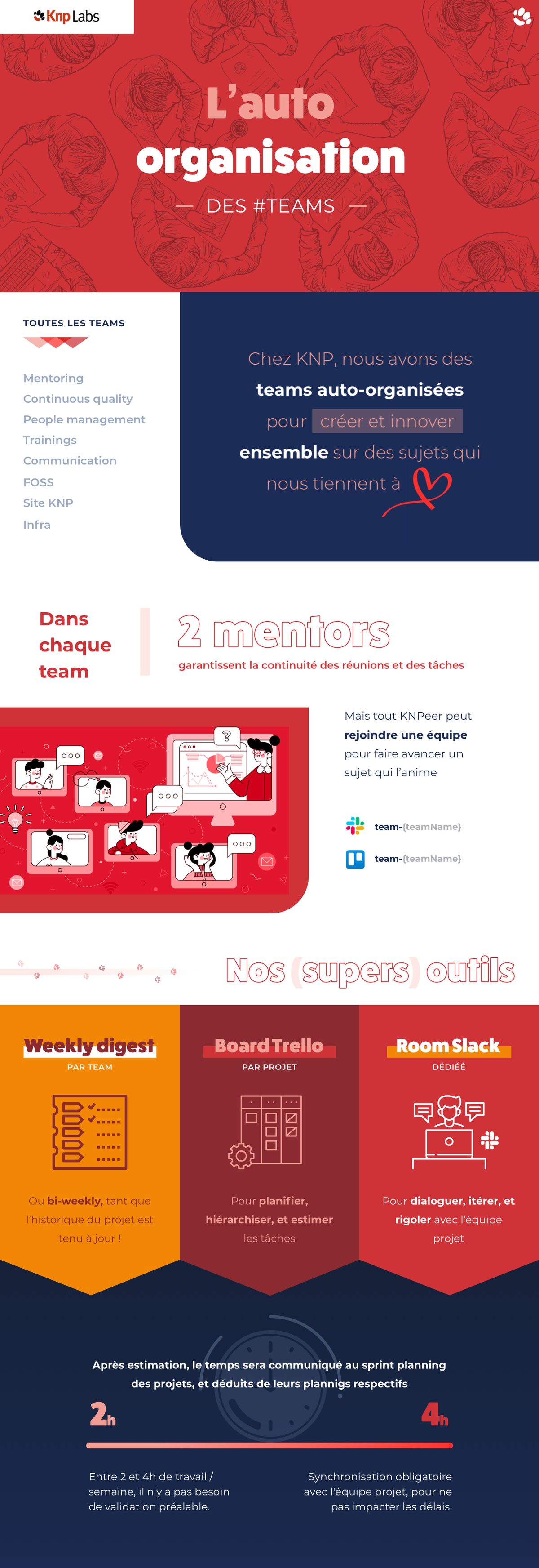 Chaque Team s'auto-organise pour mettre en place et suivre des sujets chez KNP : transmissions de nos valeurs et savoir-faire aux nouveaux KNPeers, transmission de la qualité dans les projets, communiquer notre savoir faire à l’extérieur de KNP...